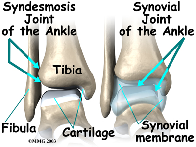 Most joints in the body are synovial joints. Synovial joints are enclosed by a ligament capsule and contain a fluid, called synovium, that lubricates the joint. The ankle syndesmosis sits next to the , where the tibia meets the talus bone.