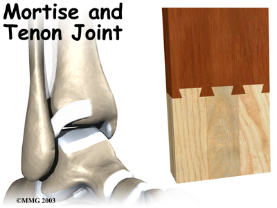 The syndesmosis ligaments hold the bottom ends of the tibia and fibula in place. This arrangement forms the upper surface of the ankle joint. The ankle joint is a hinge joint. The hinge is formed where the tibia and fibula sit above the talus bone. This connection is called a , a stable connection that woodworkers and craftsmen routinely use to create strong and stable constructions.