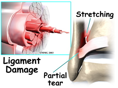 An ankle syndesmosis injury involves a sprain of one or more of the ligaments that support the ankle syndesmosis. A ligament is made up of of connective tissue, similar to a nylon rope. A sprain stretches or tears the ligaments. Minor sprains only stretch the ligament. A may be either a complete tear of all the strands of the ligament or a partial tear of only some of the strands. The ligament is weakened by the injury. How much it is weakened depends on the degree of the sprain.