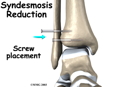 Surgery for a syndesmosis injury is designed to reduce the separation between the tibia and fibula. If there are no barriers keeping the tibia and fibula apart, the surgeon may simply need to place screws through the two bones to hold them together while the ligaments heal.