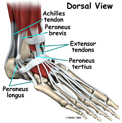 The large Achilles tendon at the back of the ankle is the most powerful tendon in the foot. It connects the calf muscles to the heel bone and gives the foot the power for walking, running, and jumping.
