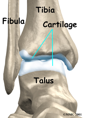 The ankle joint is made up of three bones: the lower end of the tibia (shinbone), the fibula (the small bone of the lower leg), and the talus (the bone that fits into the socket formed by the tibia and fibula). The talus sits on top of the calcaneus (the heelbone).
