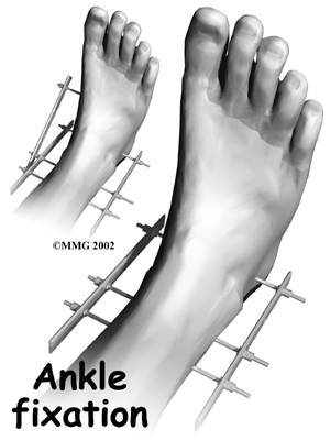 In some cases, especially if the fusion is being done because of an infection or a failed initial fusion, an apparatus called an is used to hold the bones together while they heal. This apparatus has metal pins that are inserted through the skin and into the bone. The metal pins are connected to metal rods and bolts outside the skin that hold the bones in position while the . The fixator is removed after the bones have healed, usually in 12 to 15 weeks.