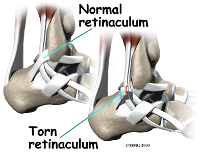 The injury to the retinaculum may be overlooked at first while treatment focuses on the injury to other ankle ligaments. This means the subluxation may begin much later, and it may not seem to be caused by the initial ankle sprain. If not corrected, this snapping of the tendons can become a chronic and recurring problem.