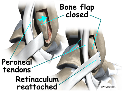 The surgeon slides the small block of bone backward, out of its original spot. The bone may be rotated slightly to create a solid barrier that will help keep the tendons from sliding around the lower edge of the fibula. A screw is inserted through the small block of bone into the fibula. The screw keeps the bony block in its until it heals.