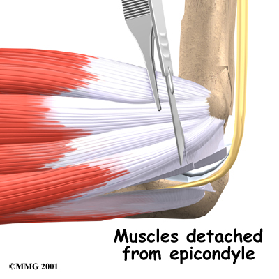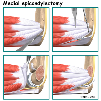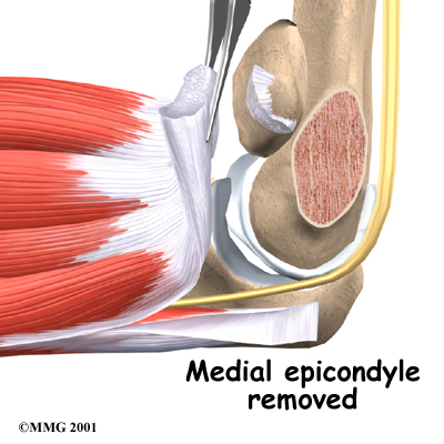 The other method simply on the inside edge of the elbow, a procedure called medial epicondylectomy. By getting the medial epicondyle out of the way, the ulnar nerve can then slide through the cubital tunnel without pressure from the bony bump.