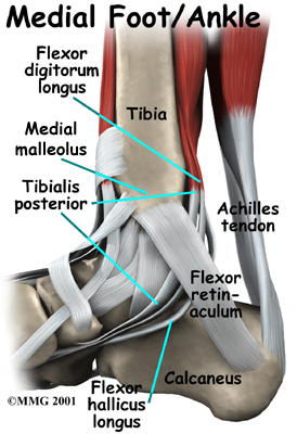 The posterior tibial tendon runs behind the inside bump on the ankle (the medial malleolus), across the instep, and into the bottom of the foot. The tendon is important in supporting the arch of the foot and helps turn the foot inward during walking.