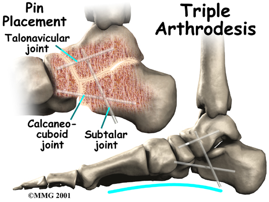Finally, in cases which have been neglected and a fixed flatfoot deformity is present, a fusion (or arthrodesis) of the foot may be required. A fusion is an operation where a joint between two bones is removed and the two bones on either side of the joint are allowed to grow together, or fuse. This type of operation is used to stop pain from joints that are worn out. It can be used to realign the bones when the mechanisms for maintaining normal alignment are lost, such as when the tendons and ligaments no longer work properly. Usually, several joints must be fused to control a flatfoot deformity that develops after a posterior tibial tendon rupture.