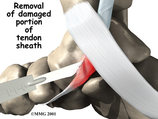 If the problem appears to be primarily tendonitis with thickening of the tissue around the tendon (the tendon sheath), a tendon debridement operation can be performed to remove the thickened tissue around the tendon. This is done to try to decrease the symptoms of pain and to prevent rupture of the tendon.