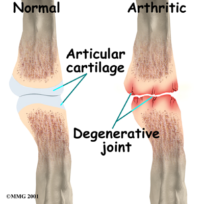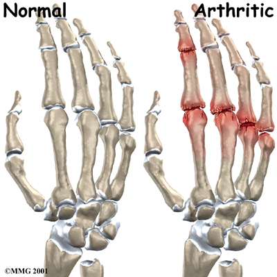 Injury to a joint, such as a bad sprain or fracture, can cause . An injury to any of the joints of the fingers, even if it does not injure the articular cartilage directly, can alter how the joint works. After a fracture, the bone fragments may heal in slightly different positions. This may make the joints line up differently. When an injury changes the way the joint lines up and moves, force can start to press against the surface of the articular cartilage. This is similar to how a machine that is out of balance wears out faster.