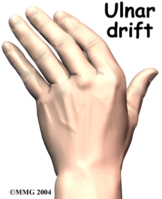 In rheumatoid arthritis, the fingers often become deformed as the disease progresses. The MCP joints of the fingers may actually begin to point sideways (towards the little finger). This is called . Ulnar drift can cause weakness and pain, making it difficult to use your hand for daily activities.