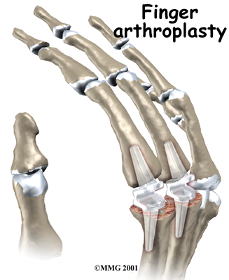 Artificial joints are available for the finger joints. These plastic or metal prostheses are used by some hand surgeons to replace the arthritic joint. The prosthesis forms a new hinge, giving the joint freedom of motion and pain relief. The procedure for putting in a new joint is called arthroplasty.