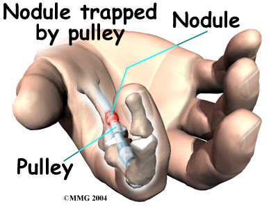 The clicking sensation occurs when the nodule moves through the tunnel formed by the pulley ligaments. With the finger straight, the nodule is at the far edge of the surrounding ligament. When the finger is flexed, the nodule passes under the ligament and causes the clicking sensation. If the nodule becomes too large it may pass under the ligament, but it gets stuck at the near edge. The nodule cannot move back through the tunnel, and the finger is locked in the .