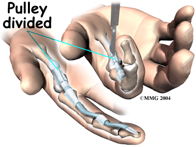 The skin and fascia are separated so the doctor can see the tendon pulley. Special care is taken not to damage the nearby nerves and blood vessels.