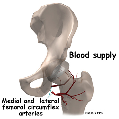 All of to the femoral head (the ball portion of the hip) comes through the neck of the femur. If this blood supply is damaged, there is no backup. One of the problems with hip fractures is that damage can occur to these blood vessels when the hip breaks. This can lead to the bone of the femoral head actually dying. Once this occurs, the bone is no longer able to maintain itself. This can lead to one of the complications of a hip fracture called avascular necrosis (AVN).