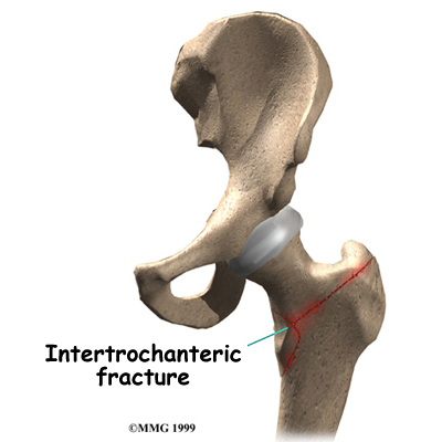 Some hip fractures occur below the femoral neck in the area called the intertrochanteric region. These fractures are called . These hip fractures are usually truly the result of a fall and often are the hardest type of fracture to treat. They often involve more than one break. As a result, several pieces of broken bone must be held together.