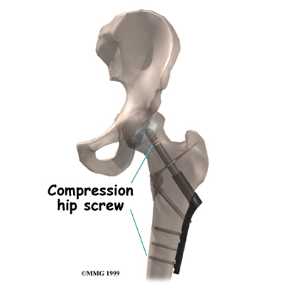 The goal of any surgical procedure to treat a fractured hip is to hold the broken bones securely in position, allowing the patient to get out of bed as soon as possible. Many methods have been invented to treat the different types of fractures. Most hip fractures are treated in one of three ways: with metal pins, with a metal plate and screws, or replacing the broken femoral head with an artificial implant.