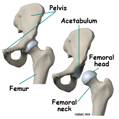 The hip joint is one of the true ball-and-socket joints of the body. The hip socket is called the acetabulum and forms a deep cup that surrounds the ball of the upper thighbone. The thighbone itself is called the femur, and the ball on the end is called the femoral head. The ball and socket arrangement gives the hip a large amount of motion needed for daily activities such as walking, squatting, and climbing stairs.
