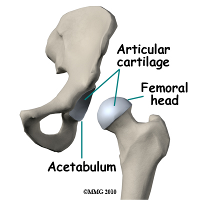 The surfaces of the femoral head and the inside of the acetabulum are covered with articular cartilage. This material is about one-quarter of an inch thick in most large joints. Articular cartilage is a tough, slick material that allows the surfaces to slide against one another without damage.