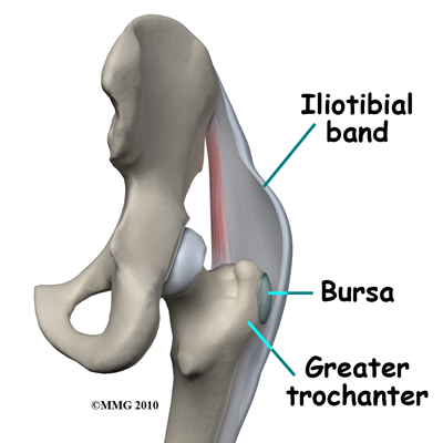 Wherever friction must occur between muscles, tendons, and bones, there is usually a bursa. A bursa is a thin sac of tissue that contains a bit of fluid to lubricate the area where the friction occurs. The bursa is a normal structure, and the body will even produce a bursa in response to friction in an area. The bursa next to the greater trochanter is called the greater trochanteric bursa.