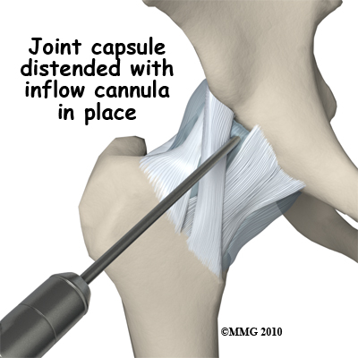 The surgeon begins the operation by making two or three small openings into the hip, called portals. These portals are where the arthroscope and surgical instruments are placed inside the hip. Care is taken to protect the nearby nerves and blood vessels. A small metal or plastic tube (or cannula) will be placed through one of the portals to inflate the hip with sterile saline.