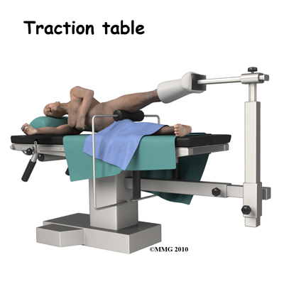 Before surgery you will be placed under either a general anesthesia or a type of spinal anesthesia. A special operating room table called a traction table will be used. The hip joint is very tight with little space between the ball and the socket. By applying traction, the surgeon is able to increase this space and allow the arthroscope to be inserted into that space. The end of the arthroscope will be moved about in this space to look throughout the joint. Sterile drapes will be placed to create a sterile environment for the surgeon to work. There is a great deal of equipment that surrounds the operating table including the TV screens, cameras, light sources, and surgical instruments.