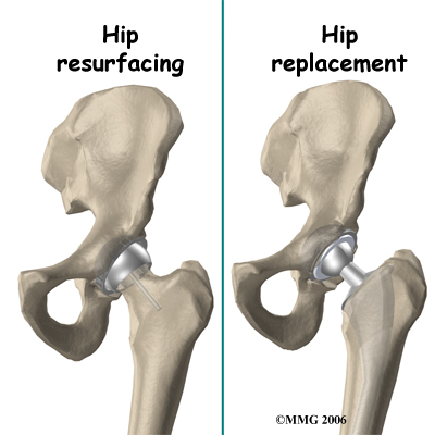 Hip resurfacing arthroplasty is a type of hip replacement that replaces the arthritic surface of the joint but removes far less bone than the traditional total hip replacement. Because the hip resurfacing removes less bone, it may be preferable for younger patients that are expected to need a second, or revision, hip replacement surgery as they grow older and wear out the original artificial hip replacement.