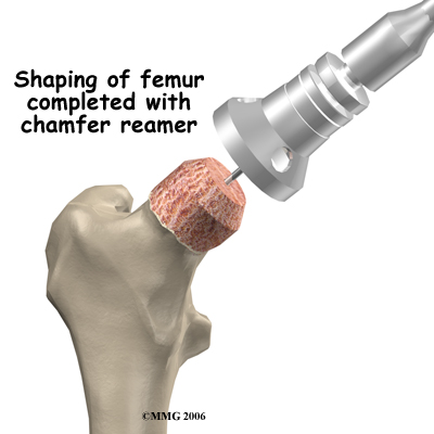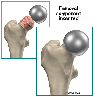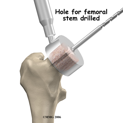 The operation begins by making an incision in the side of the thigh. This allows the surgeon to see both the femoral head and the acetabulum (or socket). The femoral head is then dislocated out of the socket. Special powered instruments are used to the bone of the so that the new metal surface will fit snugly on top of the bone.