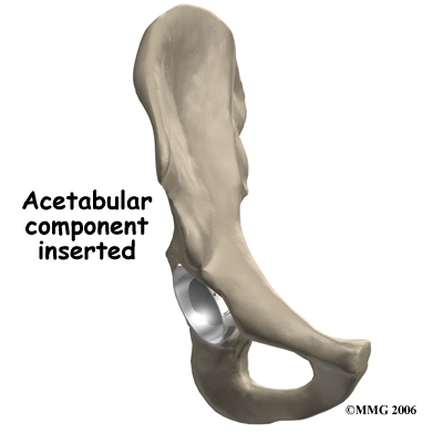 The hip socket may remain unchanged but more often it is replaced with a thin metal cup. A special tool called a is used to remove the cartilage from the acetabulum and shape the socket to fit the acetabular component. Once the shape is correct, the acetabular component is pressed into place in the socket. Friction holds the metal liner in place until bone grows into the holes in the surface and attaches the metal to the bone.