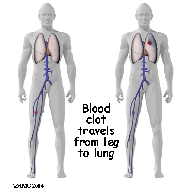 Thrombophlebitis, sometimes called deep venous thrombosis (DVT), can occur after any operation, but it is more likely to occur following surgery on the hip, pelvis, or knee. DVT occurs when the blood in the large veins of the leg forms blood clots. This may cause the leg to swell and become warm to the touch and painful. If the blood clots in the veins break apart, they can travel to the lung, where they lodge in the capillaries and cut off the blood supply to a portion of the lung. This is called a pulmonary embolism. (Pulmonary means lung, and embolism refers to a fragment of something traveling through the vascular system.) Most surgeons take preventing DVT very seriously. There are many ways to reduce the risk of DVT, but probably the most effective is getting you moving as soon as possible. Two other commonly used preventative measures include: