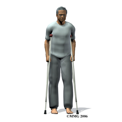 You should use your crutches or cane(s) as instructed. Your surgeon may only want you to place the toes of your operated leg down for up to six weeks after surgery. You'll advance the weight you place through your sore leg as tolerated.