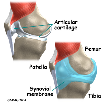 The knee joint is formed where the thighbone (femur) meets the shinbone (tibia). A slick cushion of articular cartilage covers the ends of both of these bones so that they slide against one another smoothly. The articular cartilage is kept slippery by joint fluid made by the joint lining (synovial membrane). The fluid is contained in a soft tissue enclosure around the knee joint called the joint capsule.