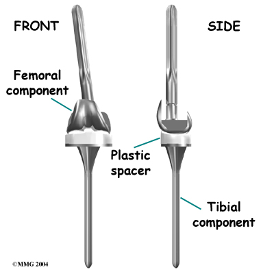 The tibial component is usually made of two parts: a metal tray that is attached directly to the bone, and a plastic spacer that provides the slick surface. The femoral component is made of metal. In some types of knee implants, the patellar component is made of a combination of metal and plastic.