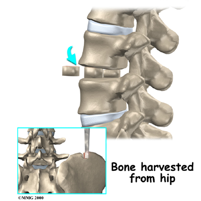 Anterior lumbar interbody fusion surgery is done through the abdomen, allowing the surgeon to work on the anterior (front) of the lumbar spine. Removing the disc (discectomy) leaves a space between the pair of vertebrae. This interbody space is filled with a . One method is to take a graft from the pelvic bone and tamp it into place. Another method involves inserting two hollow titanium screws packed with bone, called fusion cages, into the place where the disc was taken out. The bone graft inside the cages fuses with the adjacent vertebrae, forming one solid bone.