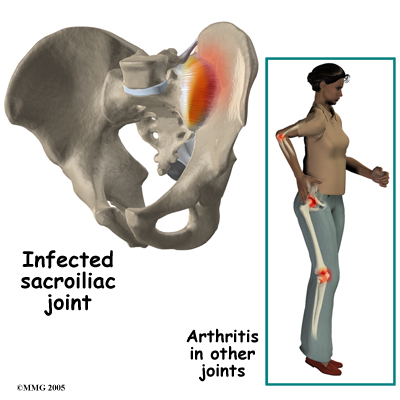 The SI joint is a synovial joint, similar to most other joints such as the knee, hip and shoulder. Due to it being a synovial joint, different types of arthritis that can affect the other joints of the body can also affect the sacroiliac joint. This includes rheumatic conditions such as rheumatic arthritis, gout and psoriasis. The SI joint can be infected when bacteria that travel in the blood settle in the joint causing a condition called septic arthritis. This is perhaps the most worrisome possible cause of SI joint pain and may well require surgery to drain the infection.