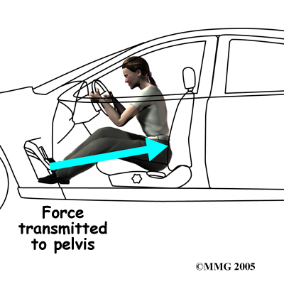 One common pattern of injury from a motor vehicle accident occurs when the driver places one foot on the brake before a collision. The impact through the foot on the brake is transmitted to the pelvis causing a twisting motion to one side of the pelvis. This can injure the SI joint on that side resulting in pain. A similar mechanism occurs with a fall onto one buttock or onto one leg, such as stepping into a deep hole or unknowingly off of a large curb. Again, the force through one side of the body, which causes a relative twisting motion to the pelvis, can injure the ligaments around the SI joint.
