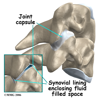 As mentioned above, there are several rheumatological diseases that can affect the spine. One of the most common rheumatological diseases is rheumatoid arthritis (RA). RA primarily attacks the synovial joints and unfortunately a lot of the joints in the body are synovial joints, such as the knee, hip, shoulder, and knuckle joints. Synovial joints are flexible connections that require the two bones can move against one another. The ends of the bones are covered with articular cartilage. Articular cartilage is a white, shiny material that is very slippery and has a limited blood supply. It provides shock absorption and allows the bones to glide easily against one another. The synovial joint is completely enclosed by a joint capsule made up of tough connective tissue on the outside and a thin layer of tissue on the inside called the synovial lining. Inside the joint there is a small amount of fluid called synovial fluid. The synovial fluid brings nutrients to the articular cartilage as it lubricates the joint.