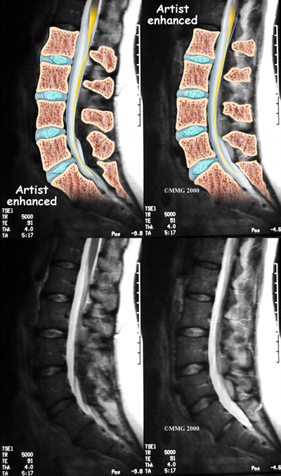 If there are symptoms suggesting the spinal nerves or spinal cord are in danger, an MRI scan may be recommended to look at the spine more closely. The MRI scan uses magnetic waves to create pictures of the lumbar spine in slices. The MRI scan shows the lumbar spine bones as well as the soft tissue structures such as the discs, joints and nerves. MRI scans are painless and don't require needles or dye. Specialized MRI techniques are now available that can detect inflammatory changes in the sacroiliac and vertebral joints long before they appear on x-rays.