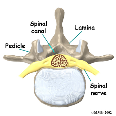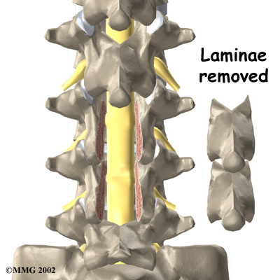 Degeneration also causes bone spurs to develop. These spurs commonly occur around the facet joints and along the edges of the vertebrae. When these spurs point into the spinal canal, they may squeeze against the spinal nerves. In a laminectomy, the surgeon removes a section of the lamina bone and any bone spurs, taking pressure off the spinal nerves. This enlarges the spinal canal so the spinal nerves have more room.
