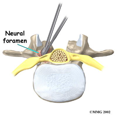 The surgeon may use small cutting instruments to carefully remove soft tissues near the spinal nerves. Then the surgeon takes out any disc fragments and scrapes off nearby bone spurs. In this way, the nerves inside the spinal canal are relieved of additional tension and pressure. The surgeon also enlarges the , if needed. The neural foramina are the small openings between the vertebrae where the nerves travel out of the spinal canal.
