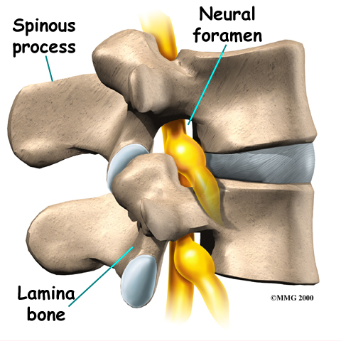 The surgeon first removes any pressure from nearby nerves. This may involve removing part or all of the lamina bone. (The lamina forms the back portion of the bony ring covering the spinal canal.) Then the surgeon takes out any disc fragments and scrapes off nearby bone spurs. In this way, the nerves inside the spinal canal are relieved of additional tension and pressure. The nerve roots are checked to see if they move freely in the spinal canal and as they leave the spine through the small holes between the vertebrae, the neural foramina. If not, the surgeon may cut a larger opening in the neural foramina. This procedure is called foraminotomy.