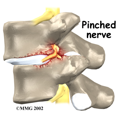 The spinal nerves are also affected by too much vertebral motion. They begin to rub where they pass through the neural foramina and become swollen and irritated. Also, the neural foramina narrow when a vertebra slides too far forward or backward over the vertebra below. This immediately where they pass through the neural foramina. Nerve swelling, irritation, and pinching produce neurogenic pain. This type of pain often radiates down one or both legs below the knee. Fusion stops this harm to the nerves.