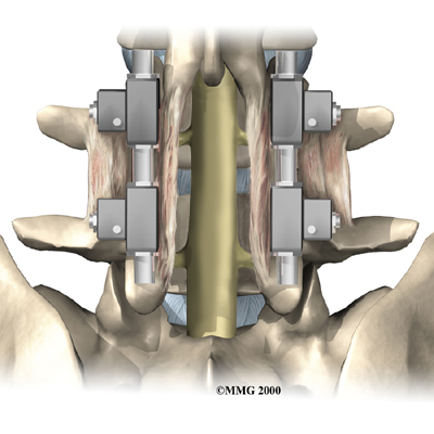 During posterior spinal fusion, the surgeon also fixes the bones in place using a combination of metal screws, rods, and plates. This instrumentation (or hardware, as it is sometimes called) holds the vertebrae to be fused together and prevents them from moving. The less motion there is between two bones trying to heal, the higher the chance they will successfully fuse. The use of instrumentation has increased the success rate of spinal fusions considerably.