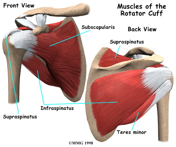 A crucial component to any shoulder rehabilitation program is the ability for you to regain what is called ‘proprioceptive control’ of your shoulder joint. Proprioception is the ability to know where your body is without looking at it. For example, normally each time you reach overhead with your hand, your mind does not consciously have to think about doing the action, yet all the muscles of the shoulder (and elbow, wrist, and upper back) coordinate the action just right so you can perform the movement without any discomfort or pinching. When you have pain in a joint, or the tissues of the joint have been injured, your proprioception declines. Any period of decreased mobility of the joint will also add to this decline. If the proprioceptive control of your shoulder is poor then the ability to use your shoulder naturally in all ranges of movement without causing any pain or pinching, or unnecessary motion, declines, and your shoulder is at risk of increased wear and tear, and developing another injury. The joint between your shoulder blade and your thoracic spine (called the scapulothoracic joint) is particularly important to the overall proprioceptive control of the shoulder joint. The outer edge of the shoulder blade actually creates the socket of the shoulder joint. Together, the scapulothoracic joint and the shoulder joint itself (including the rotator cuff muscles) create the complete shoulder girdle; the entire shoulder girdle must operate together for normal shoulder motion. Controlled shoulder girdle motion along with adequate rotator cuff strength keeps the ball of the shoulder joint properly centered in the socket of the joint and avoids any pain or undesired motion of the joint. This control and strength is particularly essential when using your limb near or above shoulder height and especially during rapid or repetitive arm movements such as throwing.