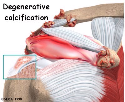 Reactive calcification is different. Why it occurs is not clear. It doesn't seem to be related to degeneration, and is more likely to cause shoulder pain than degenerative calcification. Doctors describe reactive calcification in three stages. In the pre-calcific stage, the tendon changes in ways that make calcium deposits more likely to form. In the calcific stage, calcium crystals are deposited in the tendons then they begin to disappear. The body simply reabsorbs the calcium deposits. Ironically, it is during this stage that pain is most likely to occur. In the post-calcific stage, the body heals the tendon, and the tendon is remodeled with new tissue.