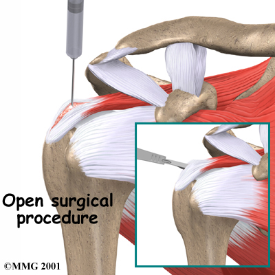 In rare instances, open surgery is necessary. In open surgery, the surgeon gets to the calcium deposit by cutting through muscles and other surrounding tissues. The tendon itself is cut to allow removal of the calcium deposits. The surgeon rinses the area to get rid of calcium crystals and then stitches the muscles and skin together.