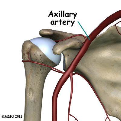 Large blood vessels supply the arm with blood. The large axillary artery travels through the axilla (armpit). If you place your hand in your armpit, you may be able to feel the pulsing of this large artery. The axillary artery has many smaller branches that supply blood to different parts of the shoulder. The shoulder has a very rich blood supply, but unfortunately if this blood supply is damaged, there is no backup.