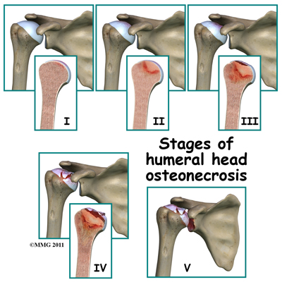 Osteonecrosis of the humeral head is a condition where a portion of the bone of the humeral head (the top of the humerus or upper arm bone) loses its blood supply, dies and collapses. Another term used for osteonecrosis is avascular necrosis. The term avascular means that a loss of blood supply to the area is the cause of the problem and necrosis means death.