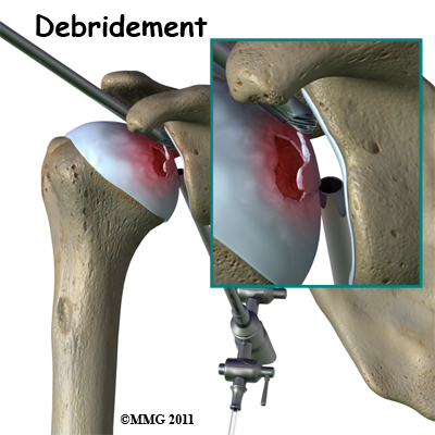 If there are any loose bits of bone or cartilage in the joint, then the surgeon may have to perform arthroscopic debridement . The arthroscope is a small fiberoptic camera that can be inserted into the joint allowing the surgeon to see the inside of the joint. Other instruments can be inserted into the joint through small incisions to remove tissue and smooth the surface of the joint. The shoulder joint is cleaned up of any debris. Any frayed edges of joint cartilage are smoothed down. Sometimes the surgeon combines these two procedures (decompression and arthroscopy). The arthroscopic exam shows the location and extent of the disease in the joint while the decompression addresses the necrotic area of bone.