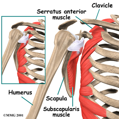 The shoulder is made up of three bones: the humerus (upper arm bone), the clavicle (collarbone), and the scapula (shoulder blade). attach to the front part of the scapula where it rests against the chest wall. One of them, called the subscapularis muscle, attaches over the front of the scapula where it faces the chest wall. The serratus anterior muscle attaches along the edge of the scapula nearest the spine. It passes in front of the scapula, wraps around the chest wall, and connects to the ribs on the front part of the chest.